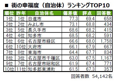 1位は5年連続で長久手市で、唯一偏差値80台の極めて高い評価を得ています。2位は、3年連続で知多郡武豊町です。3位は、昨年4位から一つ順位を上げた豊橋市です。トップ10内では、8位の額田郡幸田町(昨年13位)、9位の名古屋市千種区(昨年15位)が、昨年から順位を上げてトップ10入りしています。