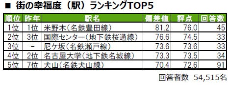 日進市に位置する米野木が、唯一偏差値80台の極めて高い評価を得て、3年連続で1位に輝きました。2位は、昨年3位から1つ順位を上げた名古屋市中村区に位置する国際センターです。3位は初登場の名古屋市北区に位置する尼ケ坂で、昨年は累計回答者数が30名未満でランキングの集計対象外でした。その他トップ10内では、6位の刈谷市に位置する逢妻が、昨年16位から順位を上げてトップ10入りしています。