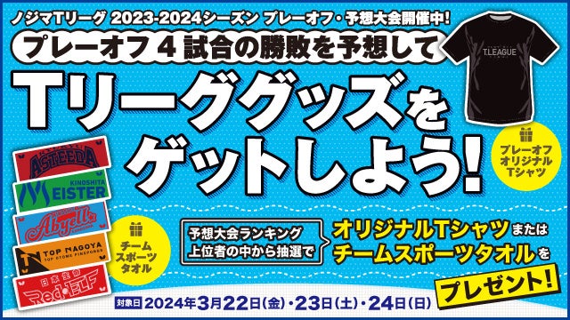 Tリーグの公認予想SNS「スポニティ」では、3月15日よりノジマTリーグ 2023-2024シーズン プレーオフ予想大会を開催いたします。
