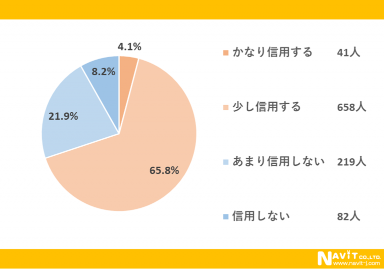 「口コミサイトの情報を信用しますか?」という質問については、「かなり信用する」が4.1%、「少し信用する」が65.8%という結果になり、合わせると69.9%の人が信用していることが分かりました。