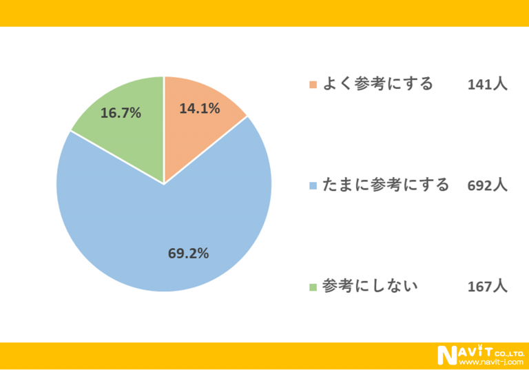 「口コミサイトを参考に商品等を購入しますか?」という質問については、「よく参考にする」が14.1%、「たまに参考にする」が69.2%という結果になり、合わせると83.3%の人が口コミサイトを参考に商品等を購入していることが分かりました。