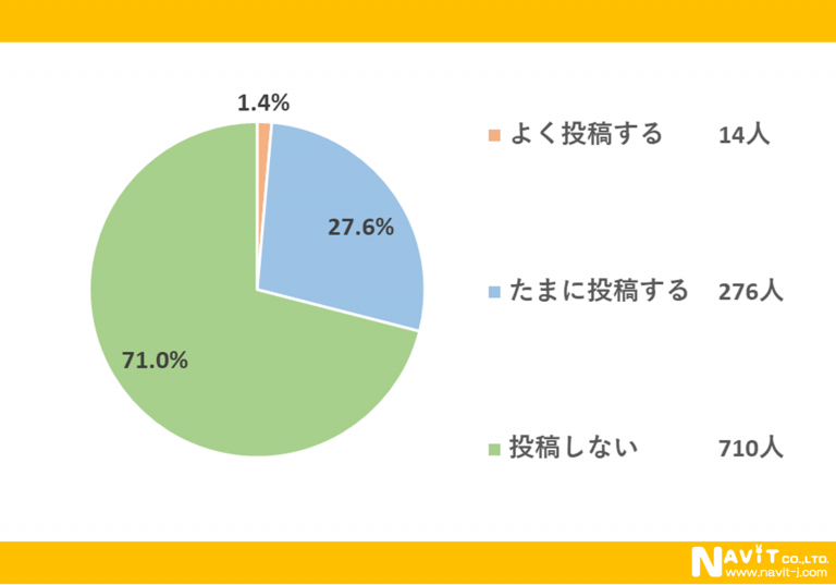 「口コミサイトへ投稿をしますか?」という質問については、「よく投稿する」が1.4%、「たまに投稿する」が27.6%という結果になり、合わせると29.0%の人が口コミサイトに投稿していることが分かりました。