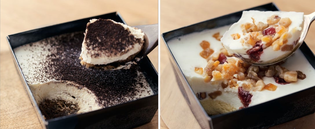 ティラミスは、コーヒーシロップをビスキュイに染み込ませるだけでなく、炭焼きコーヒーの粉を天面にもトッピングしています。一般的に使用されるココアパウダーの代わりにコーヒーパウダーをトッピングに使うことで、コーヒーの苦みや深みをより楽しんでいただけます。ドライフルーツとリコッタのチーズケーキは、爽やかな酸味のリコッタを使用したチーズムースに、食感や風味の違いを楽しめるよう、ドライクランベリー、オレンジピール、くるみをトッピングに使用しています。シロップを染み込ませたスポンジも入れることで、風味や食感にアクセントを加えています。