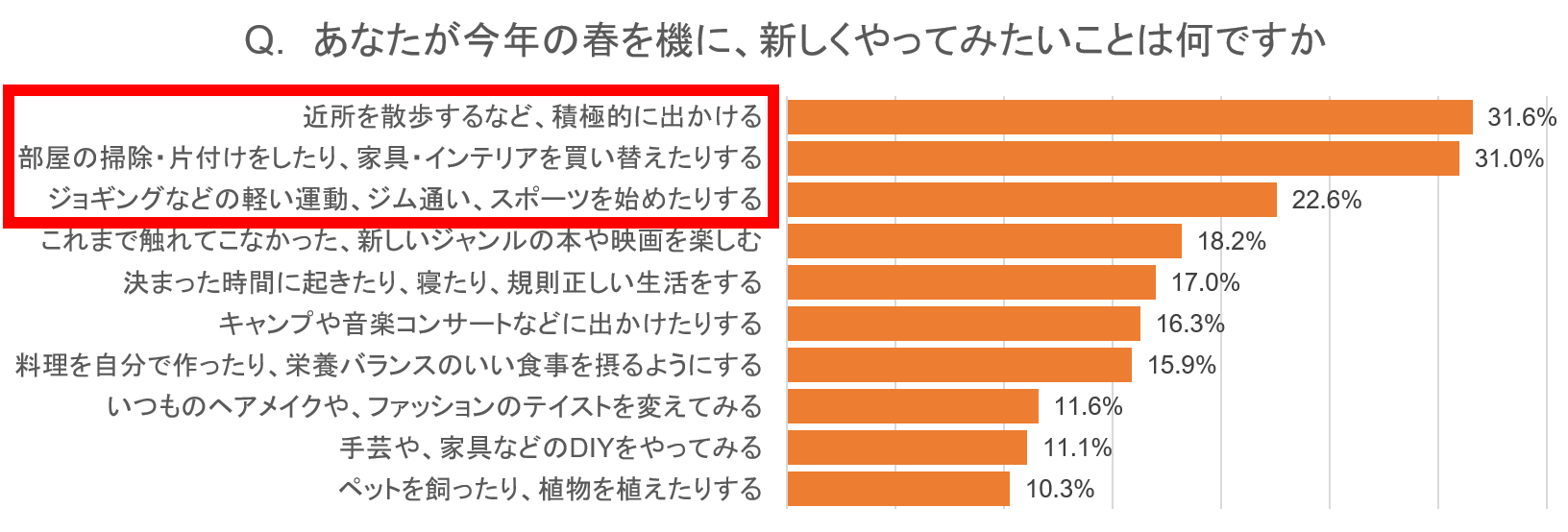 新しくやってみたいことを具体的に聞いたところ、近所の散歩やジョギング、ジム通いに加えて、部屋の整理やインテリアの買い替えなど、簡単に始められることに注目が集まり、そのために必要なモノとして、ホーム・キッチン用品、スポーツ・フィットネス用品、ファッションなどへの関心が高いこともわかりました。