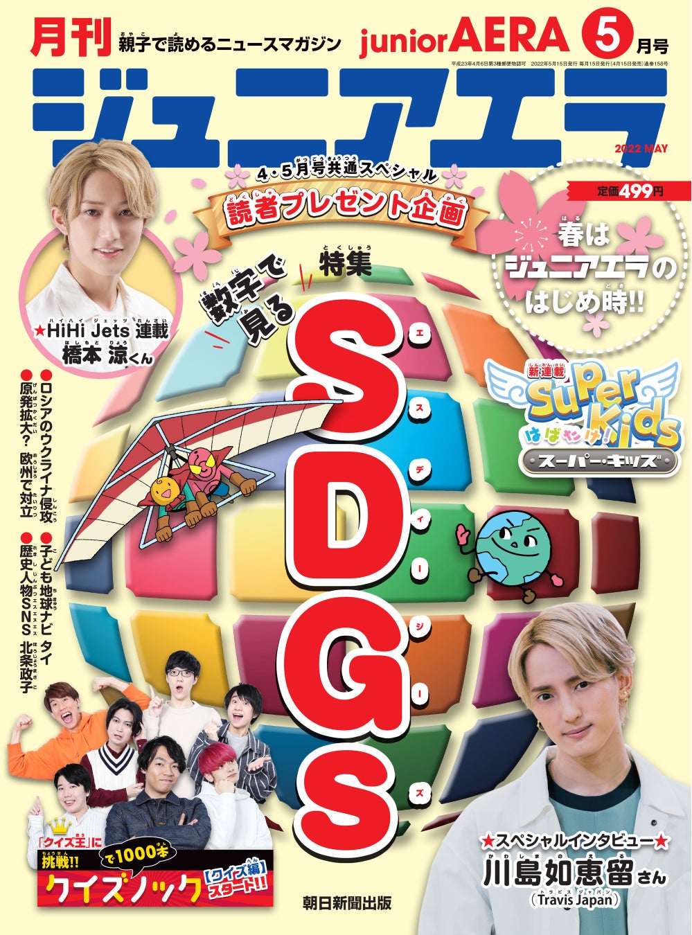 小中学生向けニュース月刊誌「ジュニアエラ5月号」が、4月15日(金)に発売されました。5月号は、SDGsを大特集。このほか、ロシアのウクライナ侵攻や、小学5・6年生で広がる「教科担任制」などのニュースをわかりやすく解説します。スペシャルインタビューは、ジャニーズJr.の人気グループTravis Japanの川島如恵留さん。HiHi Jetsの新連載では橋本涼さんが登場しています。新年度のスタートに、学びも楽しさも詰まった一冊、ぜひご覧ください。