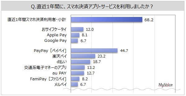直近1年間にスマホ決済を利用した人は7割弱です(ネットショッピング含む)。