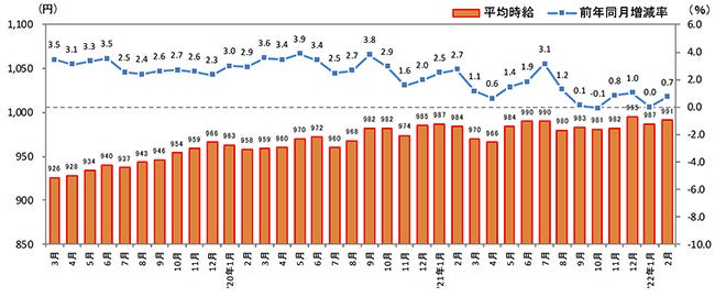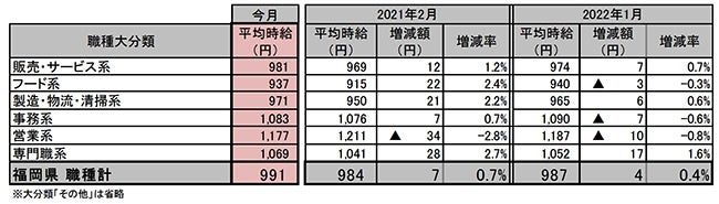 [福岡県版]2022年2月度 アルバイト・パート募集時平均時給調査 福岡県の2月度平均時給は前年同月より7円増加の991円