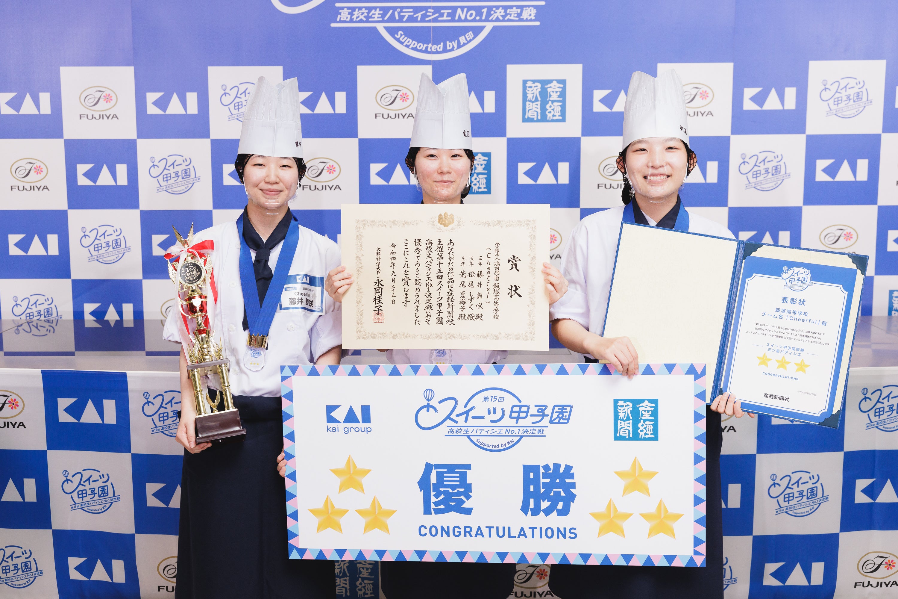 飯塚高等学校「Cheerful(チアフル)」のメンバー3人=写真左=と、作品「Noel blanc(ノエルブラン)」