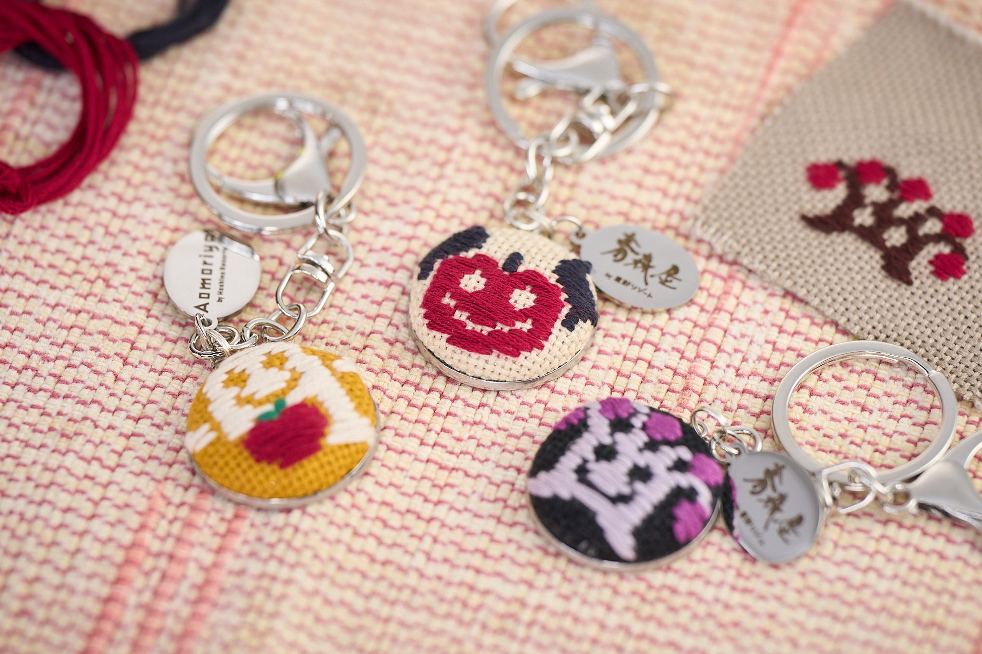 青森の伝統工芸「こぎん刺し」の技法を使った、オリジナルのハロウィンデザインのキーホルダーを作る体験を提供します。コウモリやおばけなどのハロウィンにまつわるモチーフに、青森らしいりんごを組み合わせたデザインが特徴です。ハロウィンカラーの糸を使って一針ずつ刺し、完成後はその場でキーホルダーに加工します。青森の文化に触れながら思い出を形にできます。