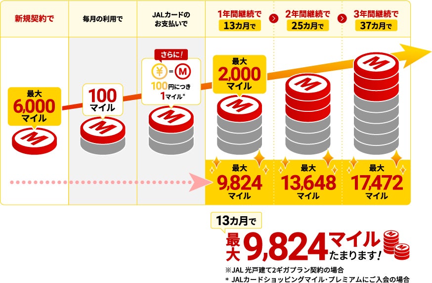 「JAL光 powered by NURO 光」では、最大通信速度が下り最大2Gbps(*1)のプランと、上り下り最大10Gbps(*2)のプランを提供します。「NURO 光」の高速で安定した通信を日々利用しながら、マイルをためられる点が特長です。マイルは、新規契約時と毎月のインターネットの利用、1年ごとの利用継続でたまる仕組みとなり、13か月間の利用で最大9,824マイルがたまります。(*3)