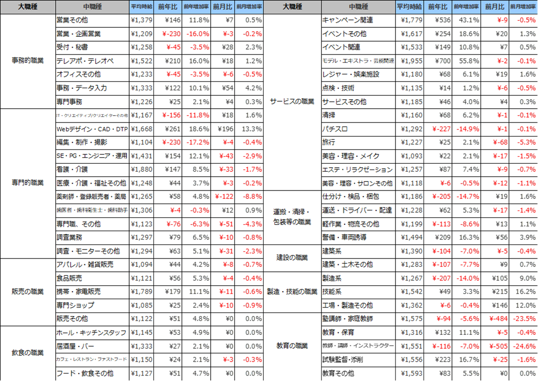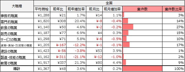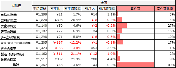 事務的職業は1,288円(前年比21円増、前月比14円増)、専門的職業は1,820円(前年比308円増、前月比8円減)、飲食の職業は1,140円(前年比50円増、前月比2円減)、販売の職業は1,187円(前年比77増、前月比4円増)、サービスの職業は1,298円(前年比71円増、前月比6円減)、運搬・清掃・包装等の職業は1,205円(前年比167円減、前月比1円減)、建設の職業は1,423円(前年比56円減、前月比53円増)、製造・技能の職業は1,162円(前年比311円減、前月比12円減)、教育の職業は1,917円(前年比337円増、前月比80円増)となりました。