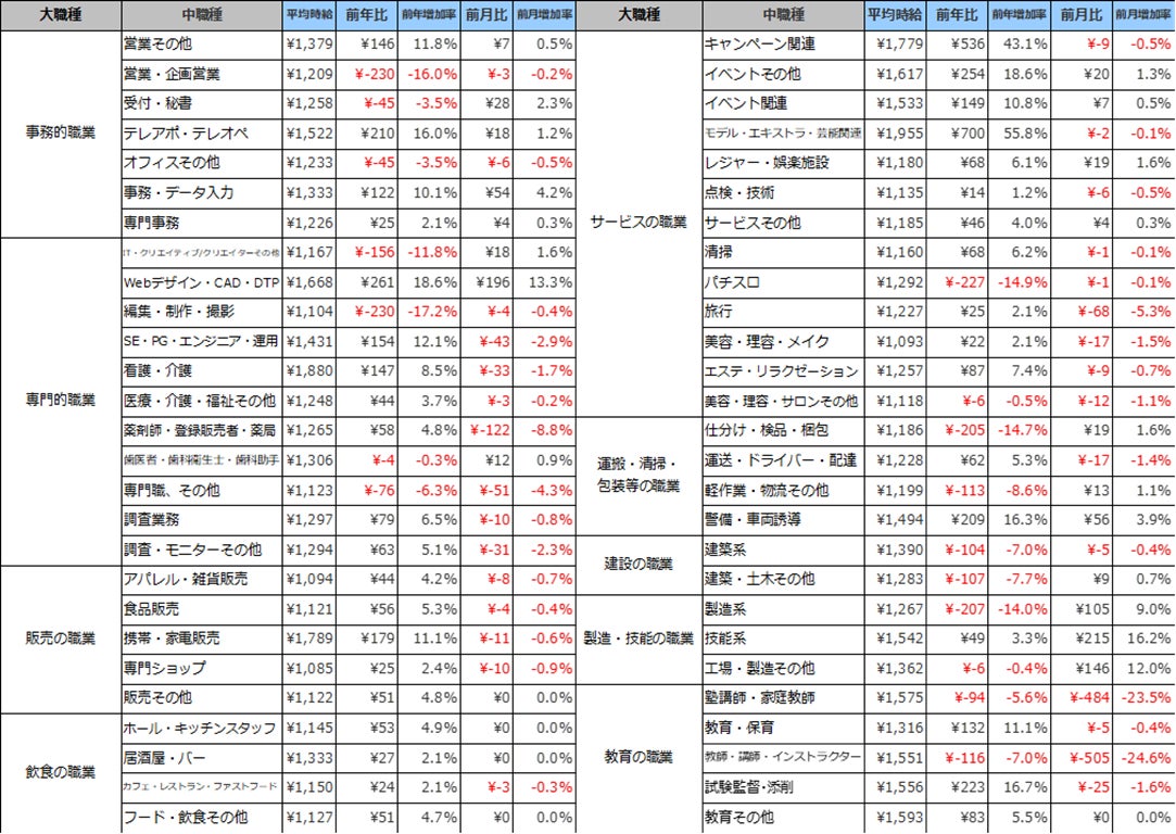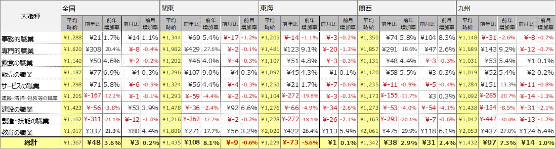 関東エリアの平均時給は1,435円(前年比108円増、前月比9円減)、東海エリアの平均時給は1,229円(前年比73円減、前月比1円増)、関西エリアの平均時給は1,342円(前年比38円増、前月31円増)、九州エリアの平均時給は1,432円(前年比97円増、前月比14円増)となりました。