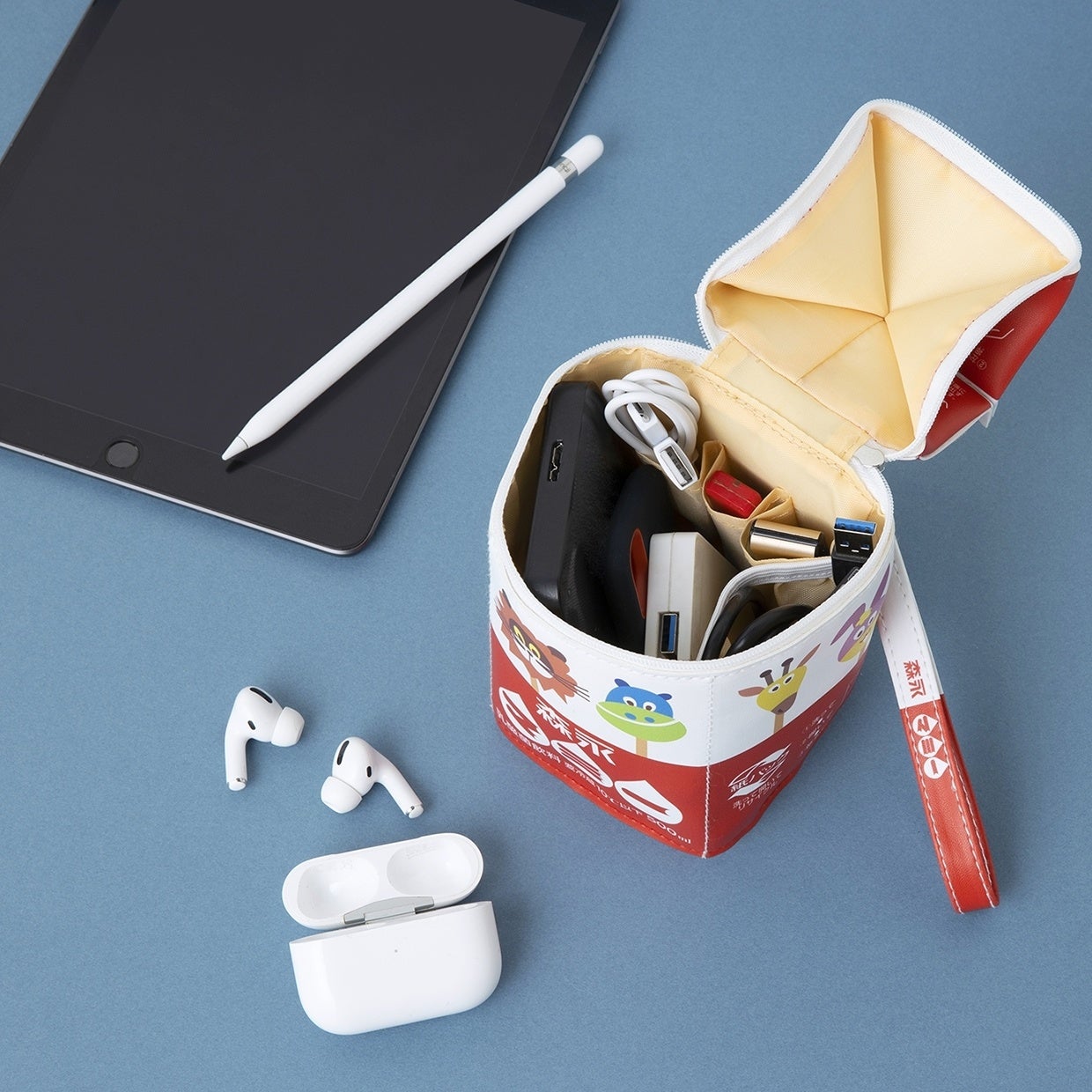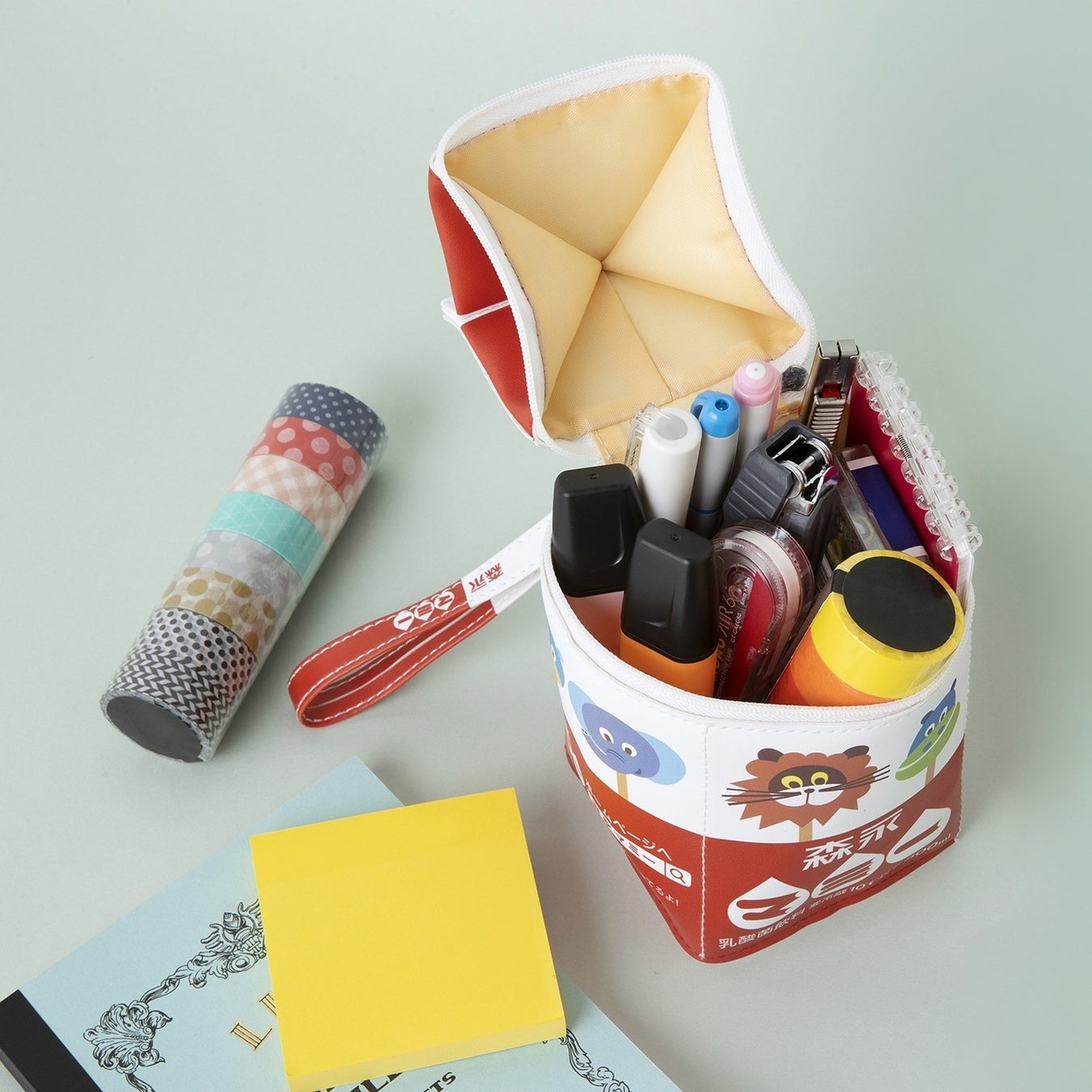 懐かしいパッケージを再現したレトロかわいいデザインで、裏地は森永マミーの飲料の色みに! 360度どこから見てもかわいいデザインに加え、ペンやコスメの収納にも便利な4つの内ポケット付きで使い勝手も抜群です。デスクに立てられる「ペンケース」として、コード類もしっかり収まる「ガジェットケース」として、大きめのパレットも収納できる「コスメポーチ」としても。様々なシチュエーションにベストマッチ! かわいいだけじゃない機能性も抜群のポーチです。