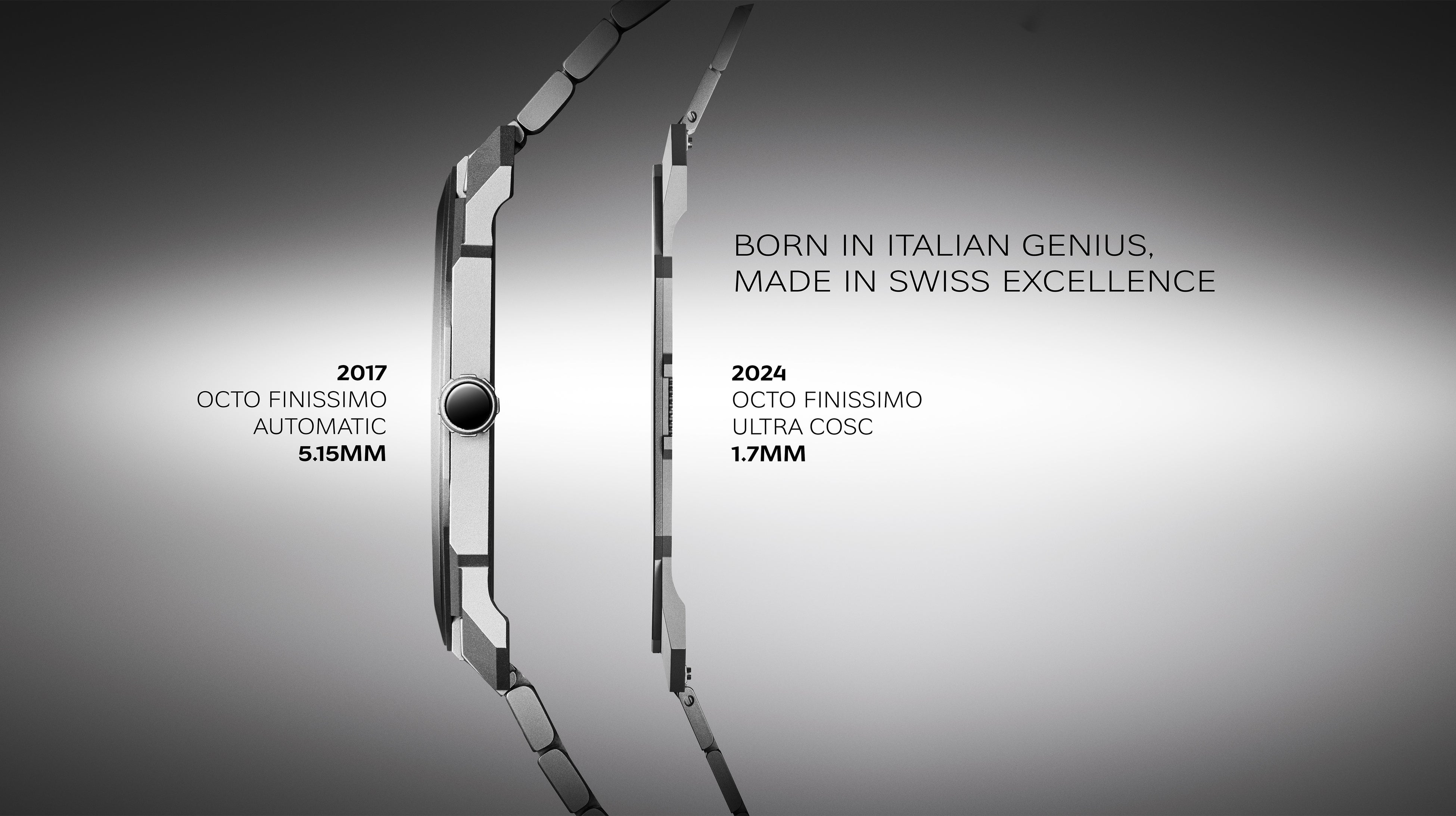 2024年3月8日ジュネーブにて発表された「オクト フィニッシモ ウルトラ COSC」は、厚さ1.7mmによりウォッチメイキングに新たな基準をもたらした9番目の世界最薄記録のタイムピースであり、同時に世界最薄のCOSC クロノメーターウォッチでもあります。既成概念にとらわれない発想により生まれた比類なきデザインのタイムピースは、COSC クロノメーター認定によりパフォーマンスの正確性が証明され、ハイエンド機械式ウォッチメイキングの世界に新たな基準を打ち立てました。