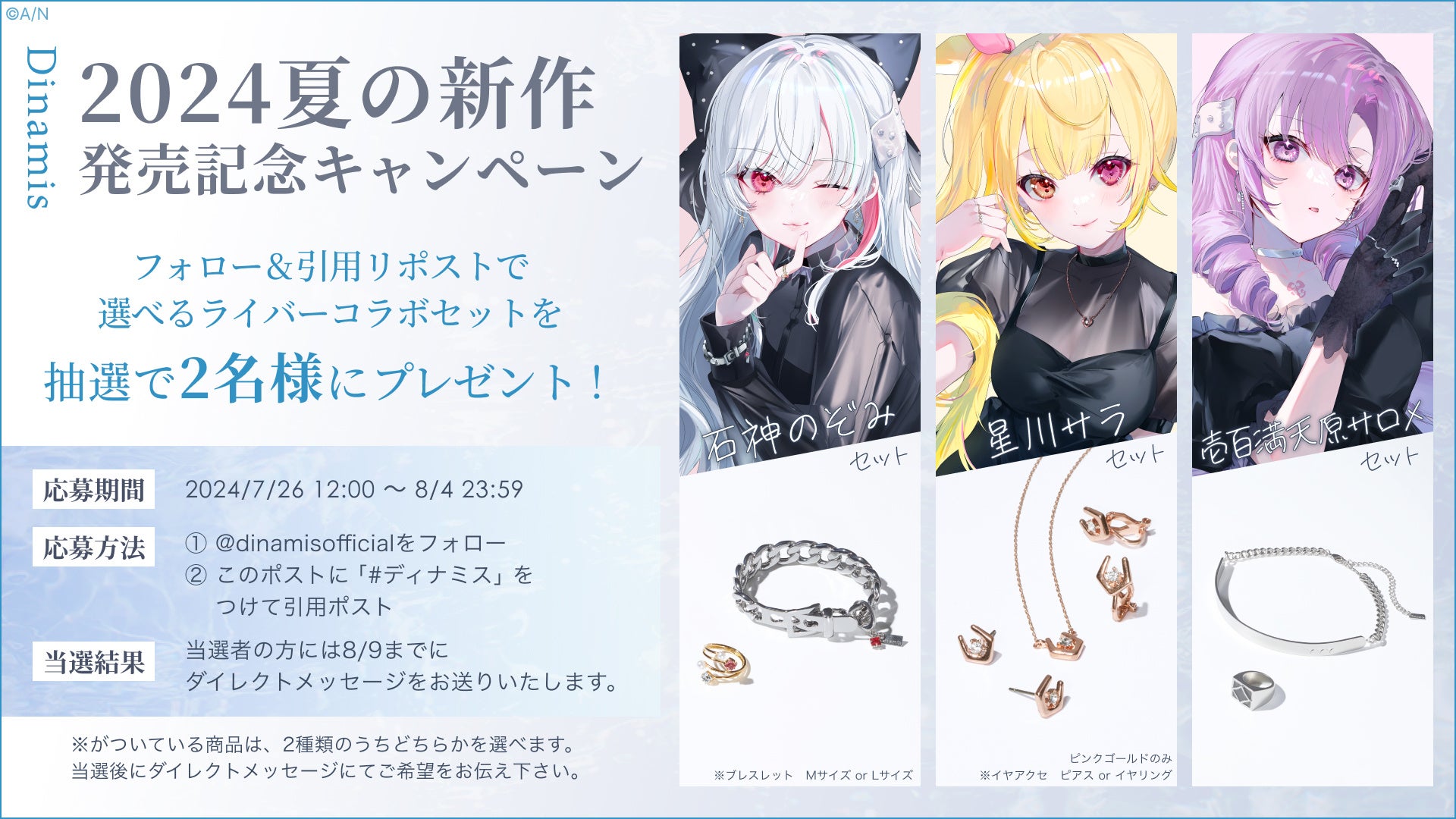 アクセサリーブランド「Dinamis(ディナミス)」は、2024年夏の新作『Dinamis 24MS Wave』の新登場を発表いたします。本コレクションでは、ブランド初となるアクセサリーでのライバーコラボレーションを実現し、人気バーチャルライバーグループ(以下VTuber)にじさんじ所属「石神のぞみ」、「星川サラ」、「壱百満天原サロメ」がプロデュースするアイテムが新登場いたします。今回の着用ルックでは、イラストレーターの美和野らぐさんにスタリングとヘアメイクをご担当いただきました。