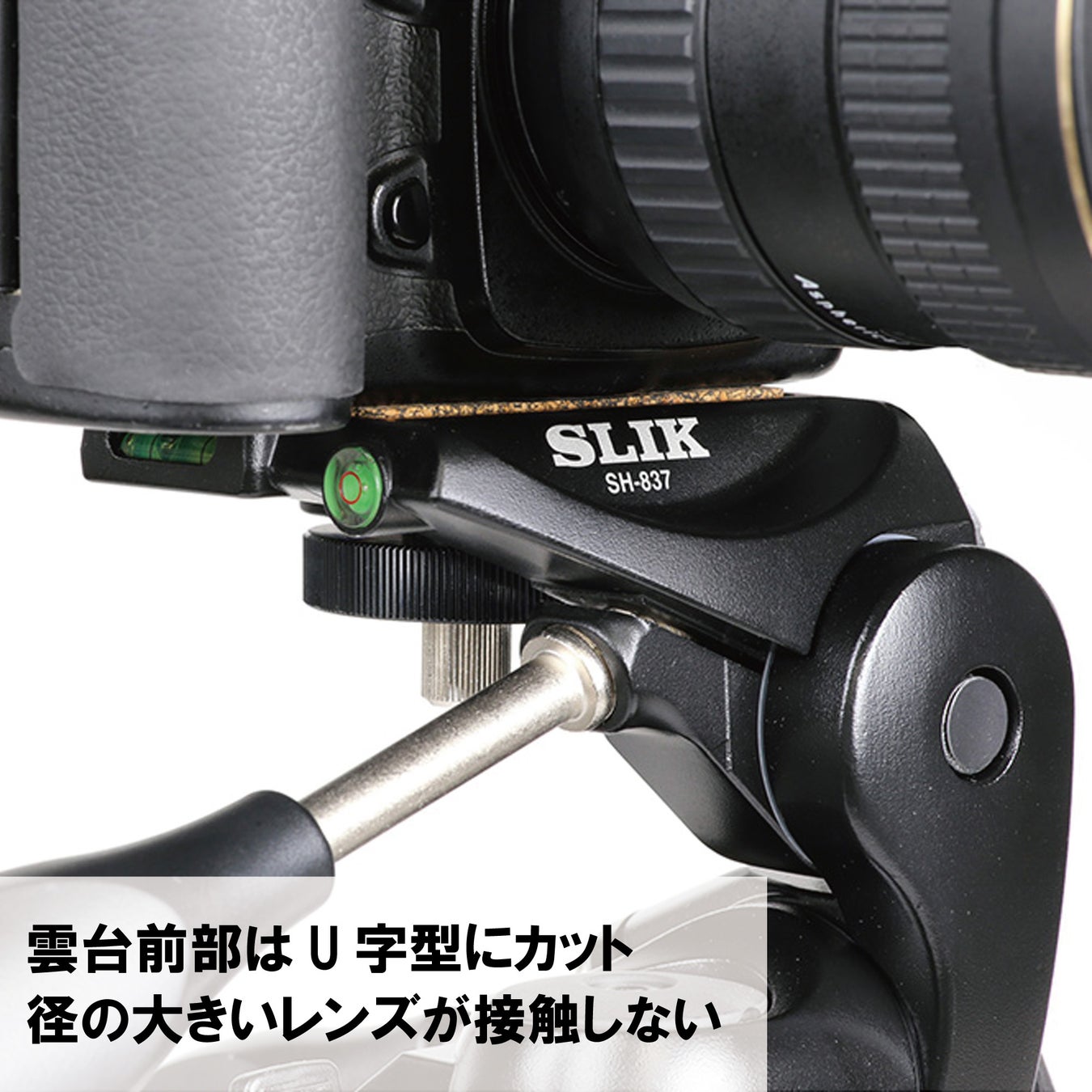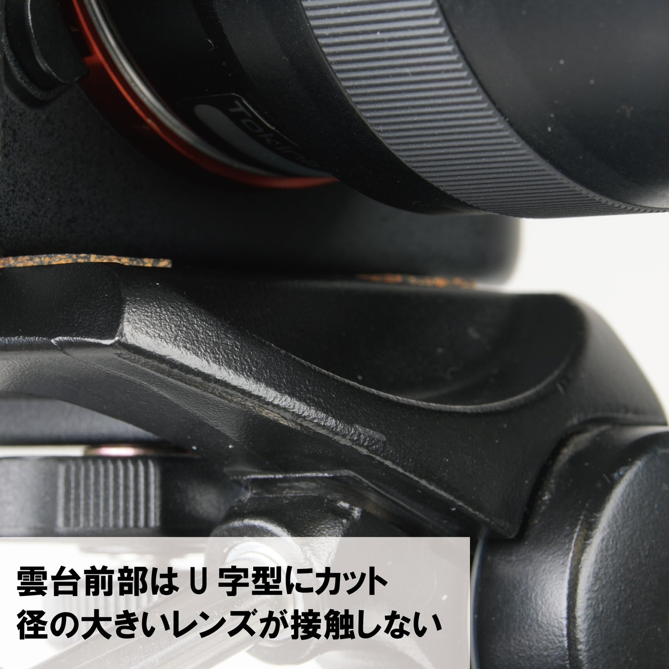 雲台前面部分はU字型にカットしており、径の大きいレンズがカメラ台にぶつからないように考慮しています。