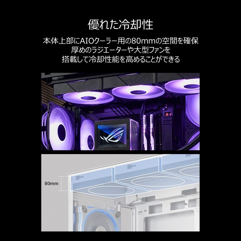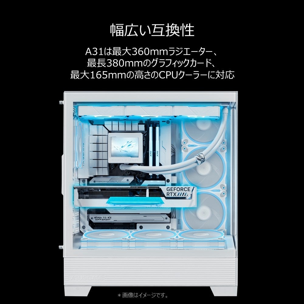 ASUS JAPAN株式会社は、ボトムに機能性と美しさを兼ね備えた8度のゴールデンアングルを採用し、トップは最大80mm厚のファンを組み合わせたラジエターに対応できる、幅広い互換性を持つピラーレスデザインの「ASUS A31 Case」ブラックとホワイトの2色を発表しました。
