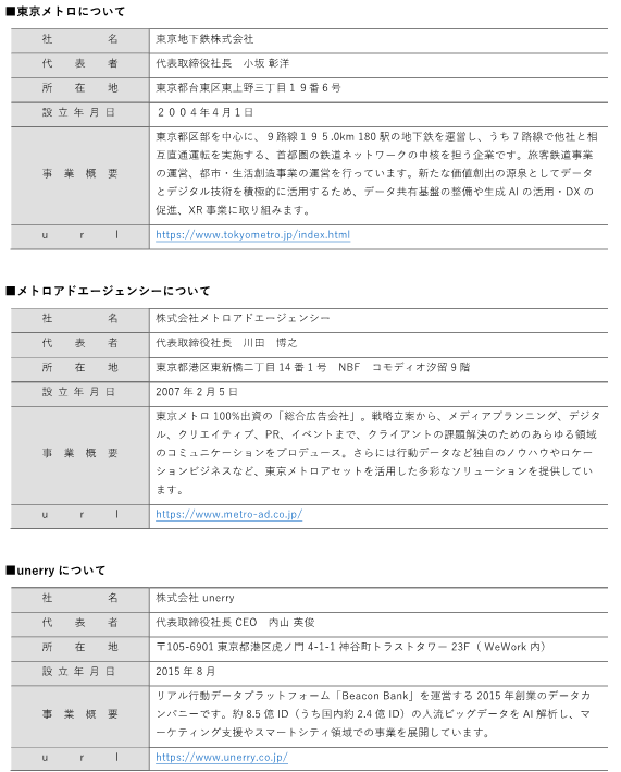 *本ニュースリリースに記載された商品・サービス名は東京地下鉄、メトロアドエージェンシー、unerryの商標または登録商標(出願中含む)です。