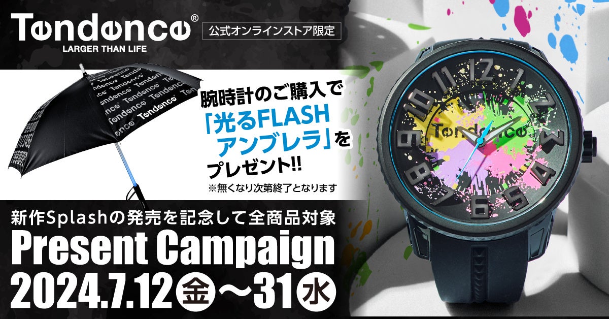 「GULLIVER Splash(ガリバースプラッシュ)」復活発売記念として、テンデンス公式オンラインサイトでは、7月12日(金)~7月31日(水)までの期間、テンデンスの腕時計をご購入いただきました方に光る「FLASHアンブレラ」をプレゼントいたします。
