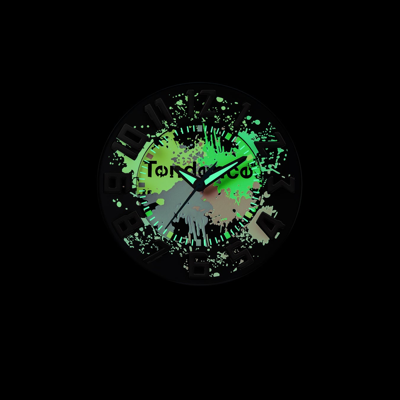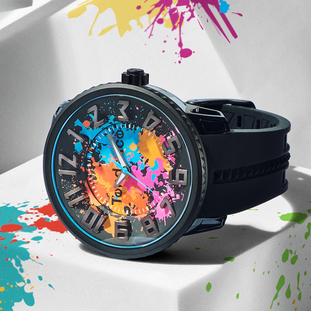 キャンバスに飛び散ったアクションペインティングのようなデザインで、ビビッドな色彩が文字盤全体に広がるダイナミックなウォッチ。様々なカラーコンビネーションからは強いエネルギーを感じさせ、視覚的なインパクトを与えます。