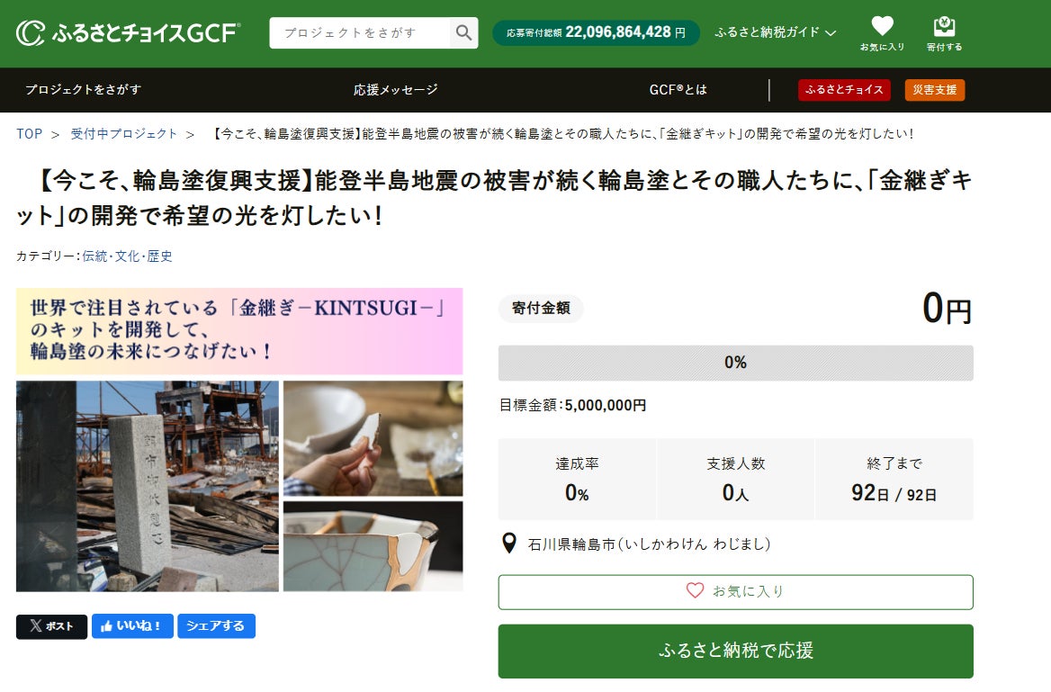 石川県輪島市(市長:坂口 茂、以下「輪島市」)と国内最大級のふるさと納税総合サイト「ふるさとチョイス」( https://www.furusato-tax.jp/ )を企画・運営する、株式会社トラストバンク(本社:東京都品川区、代表取締役:福留大士、以下「トラストバンク」)は、本日7月1日、トラストバンクが提供する、ふるさと納税制度を通じてクラウドファンディング型で寄付を募る仕組み「ガバメントクラウドファンディング®」(以下「GCF®」)で、輪島塗職人の支援を目的としたプロジェクトを開始します。募集期間は2025年7月1日~9月30日で、目標寄付金額は500万円です。