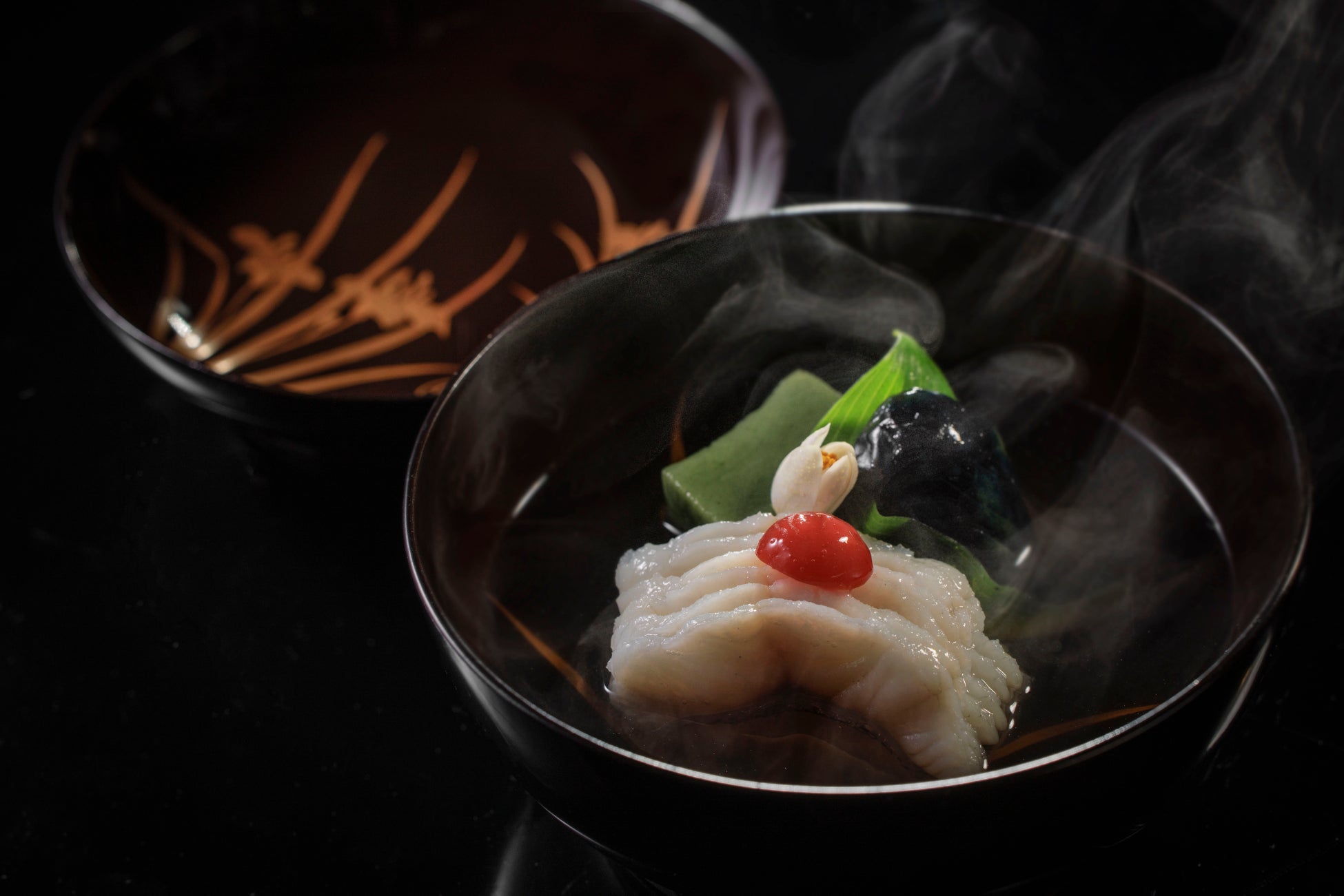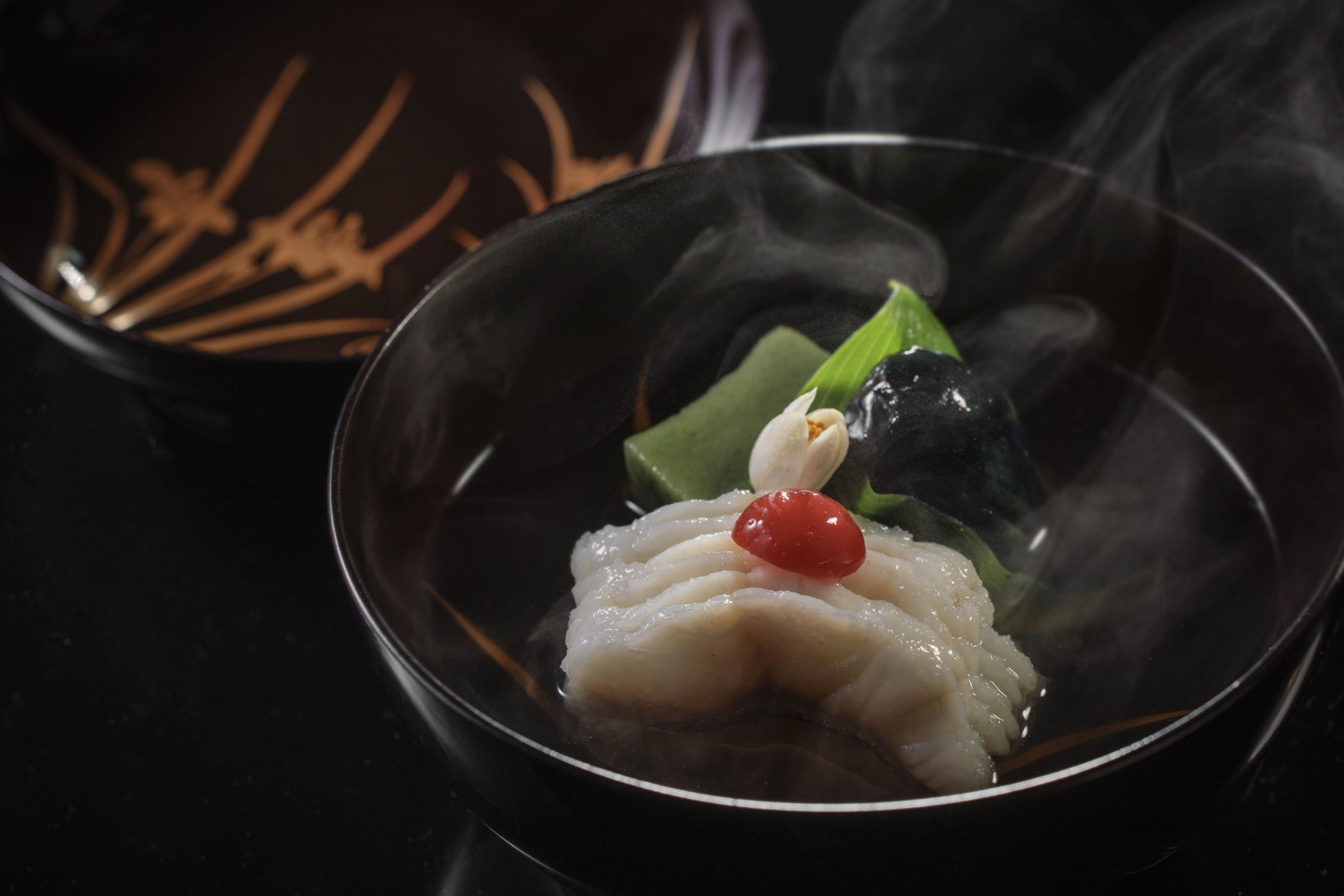 春から夏にかけて旬を迎える信濃雪鱒を主役に仕立てた椀盛です。脂ののった信濃雪鱒の旨みと、うるいのほのかな苦味、小茄子の優しい甘みが調和し、椀盛の味わいを深めます。さらに、ちぎり梅と花柚子の爽やかな香りが、全体の風味に奥深さを添えます。