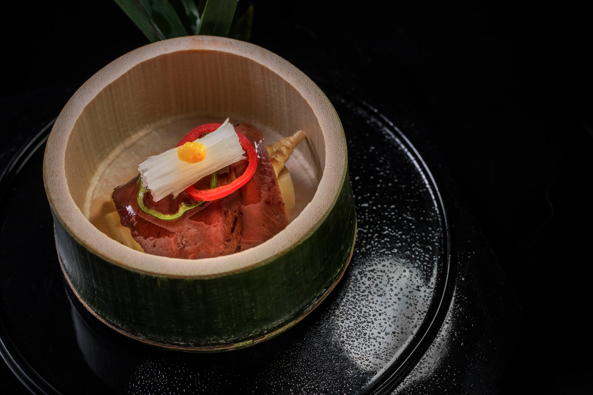 土から顔を出す筍の生命力と、鹿が好んで食べる笹の新芽に着想を得て、山の食材である根曲がり竹と鹿肉を組み合わせました。玉葱、生姜、リンゴ、糀で一日漬け込み、しっとりとした柔らかさと、滋味深い味わいが特徴の夏鹿のローストを、香ばしく焼き上げた根曲がり竹とともに、鹿出汁の餡で味えます。セロリなどの香味野菜や味噌と一緒に煮込んだ鹿出汁は、鹿肉本来の旨みを引き出し、繊細な味わいを演出します。