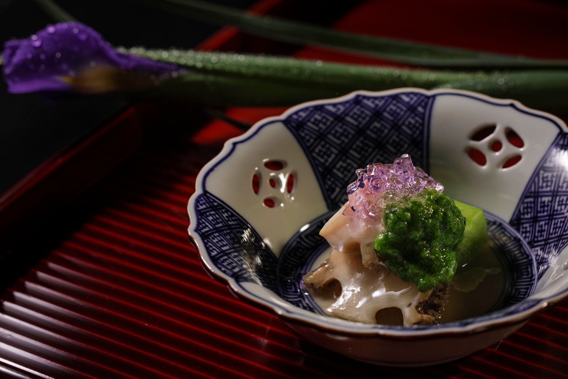 鮑や金時草など初夏に旬を迎える食材を使用した、見た目にも涼やかな先附です。柔らかく蒸し上げた鮑の歯ごたえと、シャキシャキとした白芋茎の食感が楽しめます。金時草の鮮やかな彩りが清涼感を添え、叩き陸蓮根の素朴な味わいが、全体の調和を引き締めます。あしらいの天寄せは集落に咲く紫陽花を表現しています。