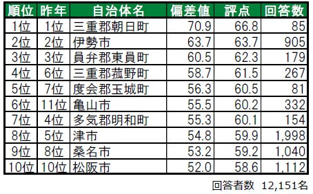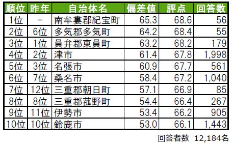 1位は初登場の南牟婁郡紀宝町で、昨年は累計回答者数が50名未満でランキングの集計対象外でした。2位は昨年6位から順位を上げた多気郡多気町、3位は員弁郡東員町です。その他トップ10内では、昨年12位だった三重郡朝日町が7位に入っています。