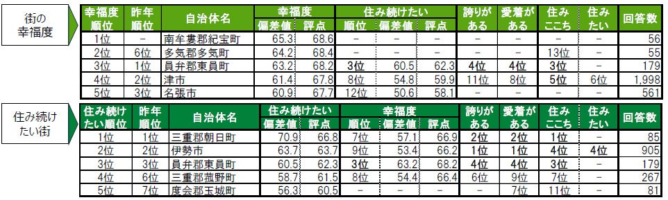 街の幸福度の1位は初登場の南牟婁郡紀宝町。2位多気郡多気町、3位員弁郡東員町。