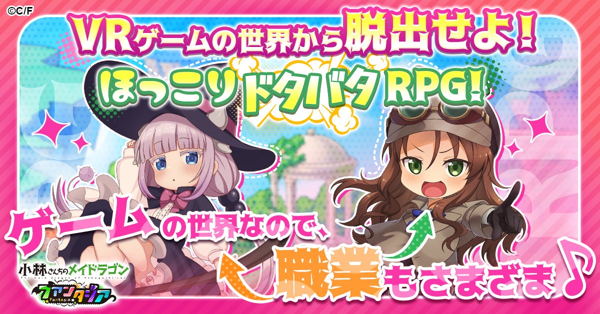 「小林さんちのメイドラゴン ファンタジア」(※以下ドラファン)は、バグでVRゲームの世界から出られなくなってしまった小林さんたちが、力を合わせて現実世界に戻る方法を探すほっこりドタバタRPGです。