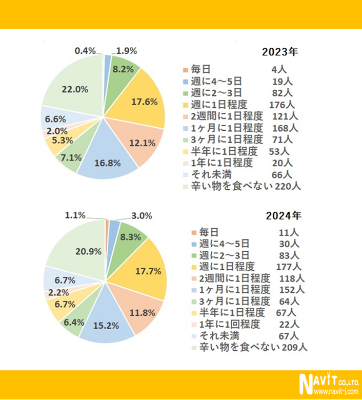 辛い料理を食べる頻度の1~3位は「週に1日程度」177人、「1ヶ月に1日程度」152人、「2週間に1日程度」118人で、前年とはほ変わりありません。数は少ないですが、「毎日」という人が11人います。
