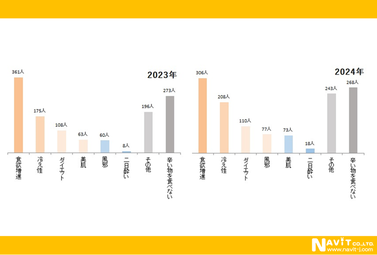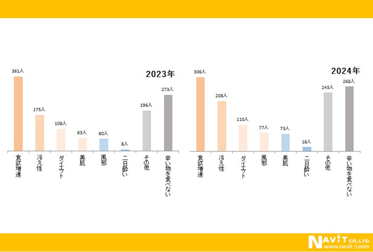 辛い料理に期待する効果は「食欲増進」が前年に比べ減ったものの306人とトップを維持。2位の「冷え性」は前年より増えて208人でした。