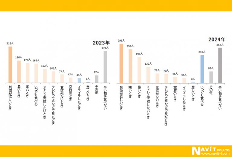 辛い物を食べたくなるのは「刺激が欲しいとき」が回答数のトップで295人。前年よりも減る結果となりました。2番目の「寒いとき」は253人で、前年よりも増えています。また「いつでも食べる」が前年より増え210人で、3位に上がっています。