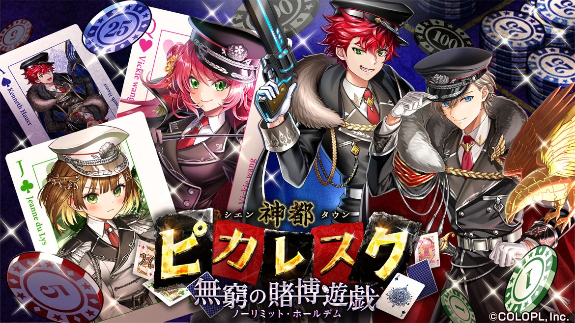 2024年1月31日(水)より、イベント「神都ピカレスク 無窮の賭博遊戯(ノーリミット・ホールデム)」を開催しております。また、同刻よりケネス(CV:吉野裕行)、ギャスパー(CV:岸尾だいすけ)、ヴィッキー(CV:藤田咲)、ジャンヌ(CV:平流エレン)が登場するガチャを開催いたします。