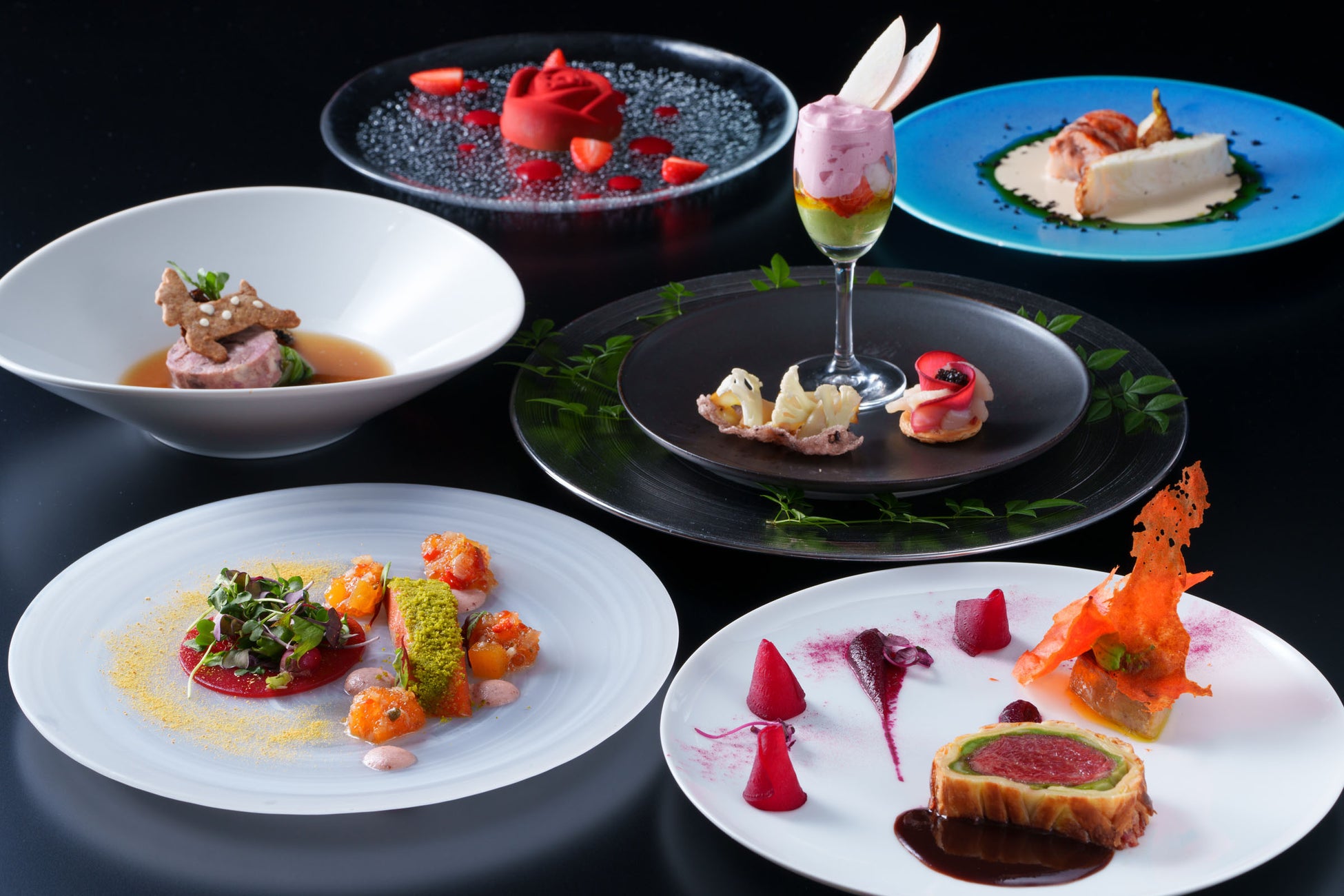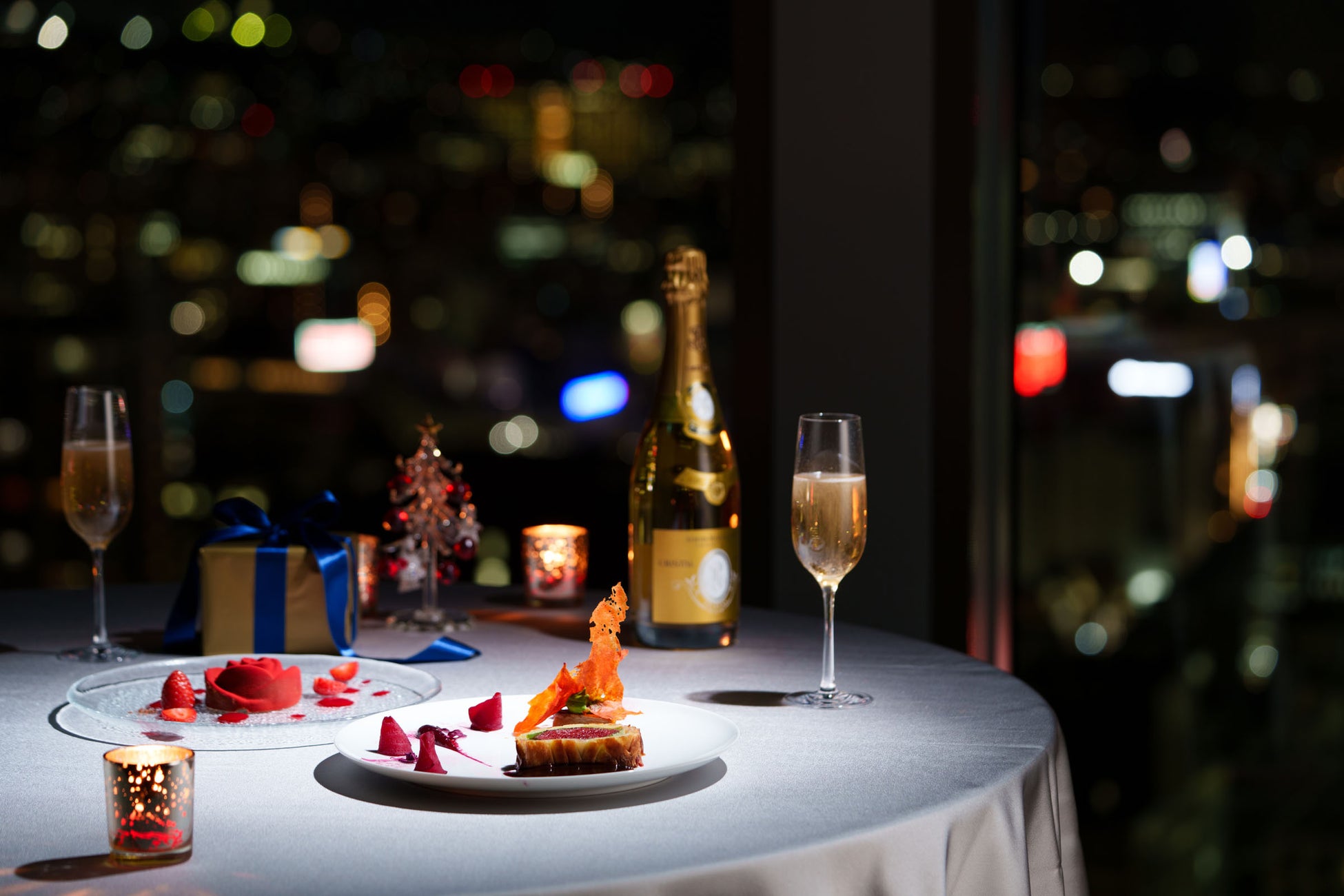 イルミネーションの広がる夜景を眺めながら、華やかな気分で楽しめるクリスマスディナーです。アミューズには、オシェトラキャビアと帆立貝のタルトレット、シャンパン香るアワビのブレゼ、りんごのエスプーマにタラバ蟹を重ねたカクテルが並び、聖夜の幕開けを盛り上げます。メインディッシュのパイ包み焼には、上品な味わいで柔らかい肉質のA4等級米沢牛のフィレ肉をチョイス。添えられたフォアグラのロティが肉の旨味を一層引き立て、赤ワインに合う逸品です。そのほか、セップ茸としょうがのクッキーを添えた鹿肉とトリュフのコンソメスープや、マナガツオのロティ、オマール海老のバロティーヌなど、クリスマスに合わせて贅沢な料理の数々をご用意。デザートは、大切な方へ贈る赤バラをモチーフにしました。酸味が効いたマンジャリチョコレートのムースを、甘酸っぱいいちごのソルベとともにお召し上がりください。