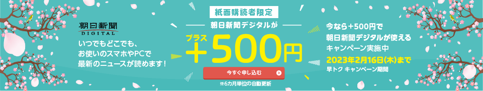 期間中は、朝日新聞本紙をご購読中のお客様限定で「キャンペーン・ダブルコース」(月額500円)をお申し込みいただけます。すべての有料記事が読み放題のほか、記事のスクラップ機能やコメント閲覧機能などの便利な機能もお試しいただけます。