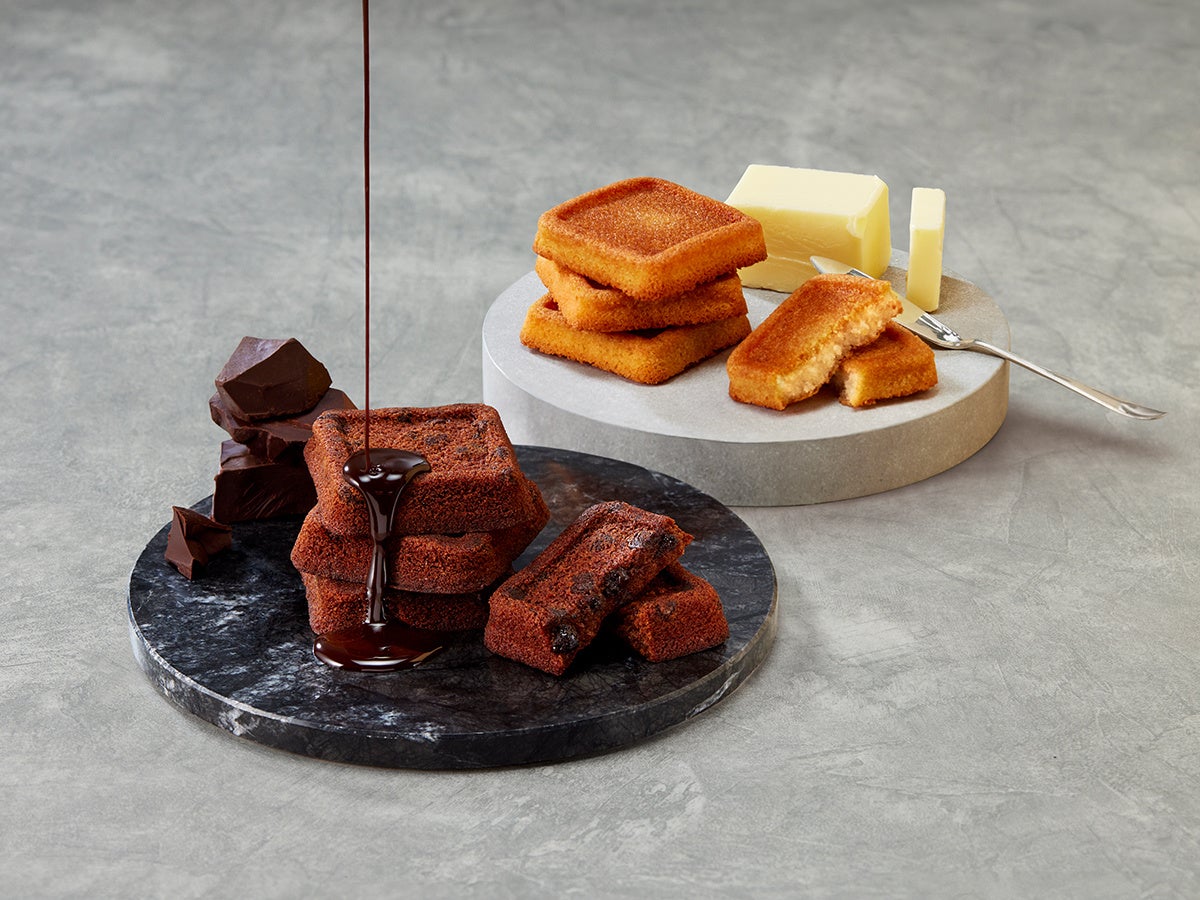 バターバトラー1番人気の「バターフィナンシェ」と冬季限定の「バターチョコレートフィナンシェ」。それぞれの味わいを食べ比べできる、おすすめの一品でございます。