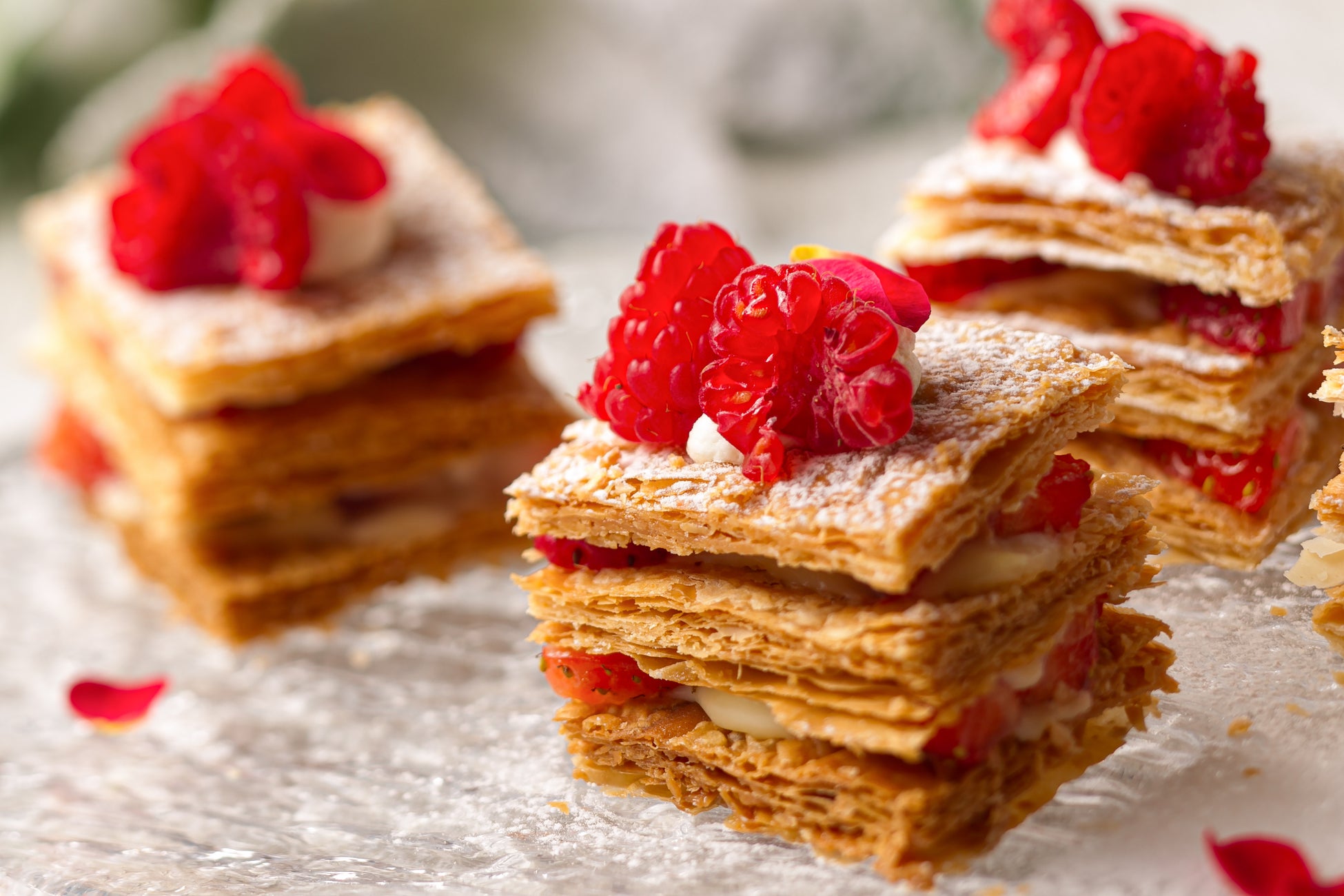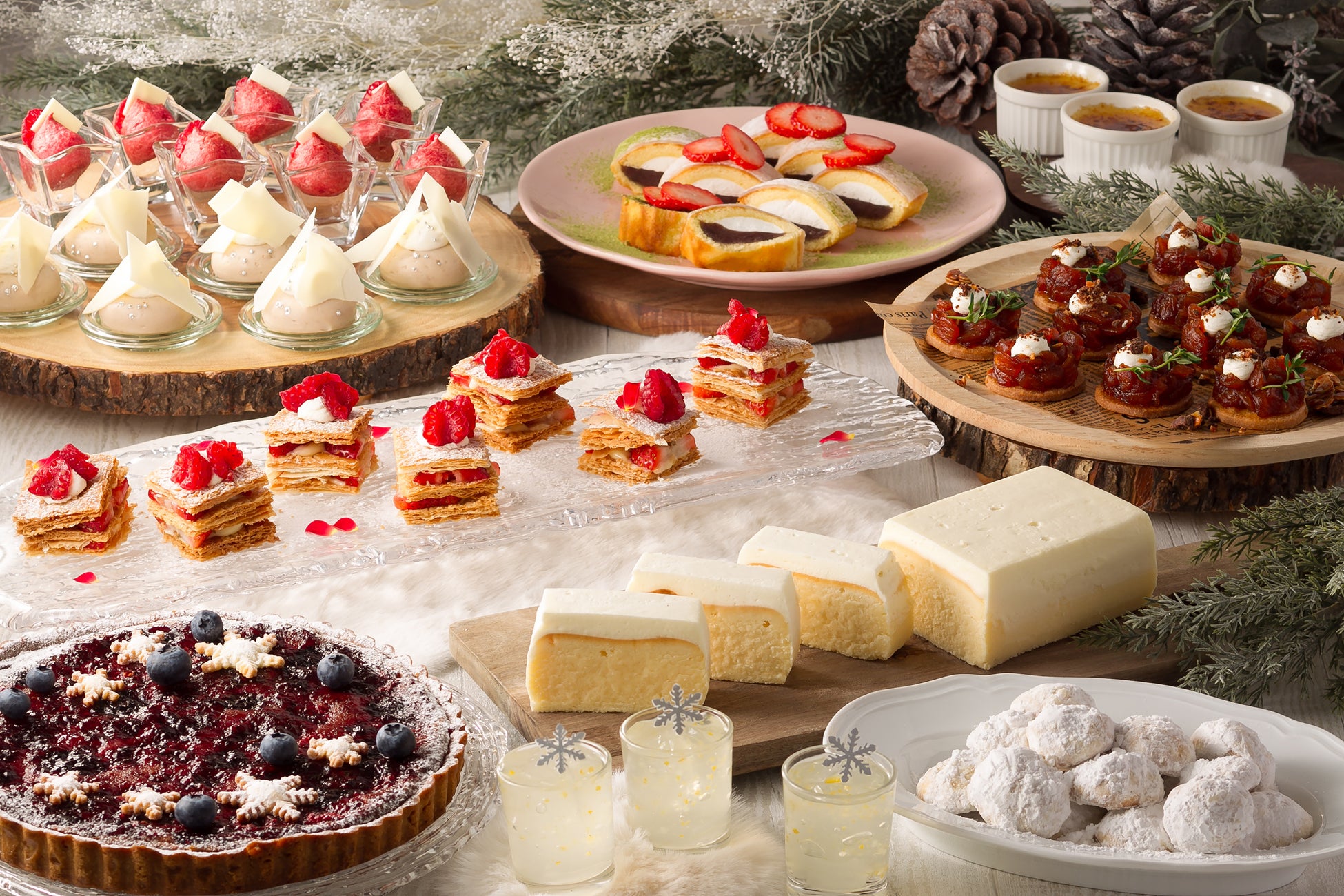 デザートブッフェのメニューには、フランボワーズやブルーベリー等様々なベリーを焼きこみ、アーモンドクリームの甘さとベリーの酸味がマッチした「ベリータルト」をはじめ、しっとり焼きこんだベイクドチーズケーキにレアチーズケーキを重ねたチーズケーキ好きにはたまらない1品「ダブルチーズケーキ」、老若男女問わず好評の「イチゴのミルフィーユ」等、季節の果物や食材を組み合わせたデザートの数々をブッフェスタイルでお楽しみいただけます。また、ホテルパティシエが目の前で仕上げるお一人様1品限定のスペシャルデザートもご用意しています。
