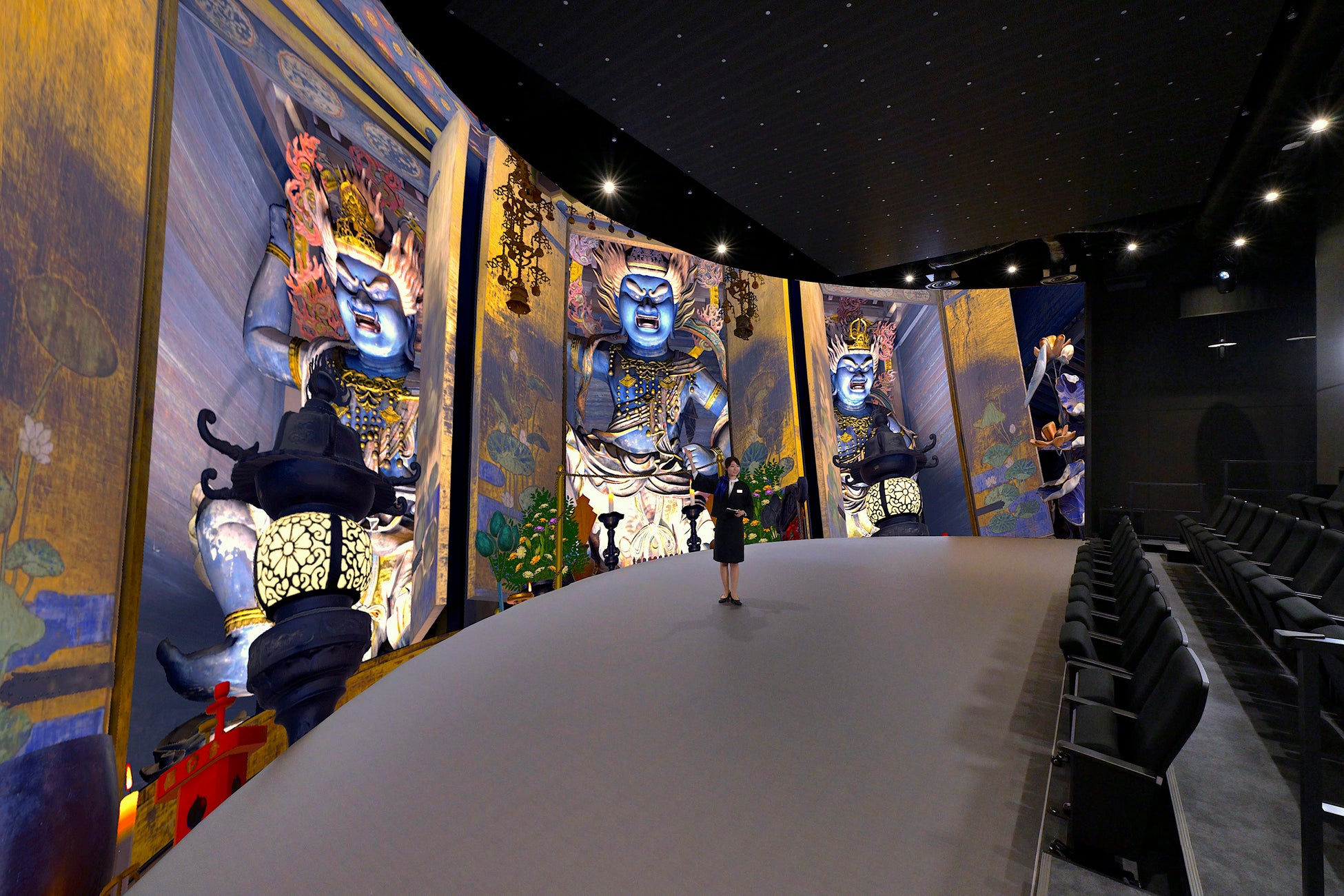本作品は、取得したアーカイブデータを活用して蔵王堂と蔵王権現立像をVRで再現し、通常では見ることのできない角度や方向から鑑賞することを可能にしました。今回は、全長20m、高さ5mの超高精細16K自発光LEDカーブビジョンを用いて上演することで、まるで現地を訪れたかのような没入体験を提供し、蔵王堂の見どころと蔵王権現立像に込められた意味を紹介します。
