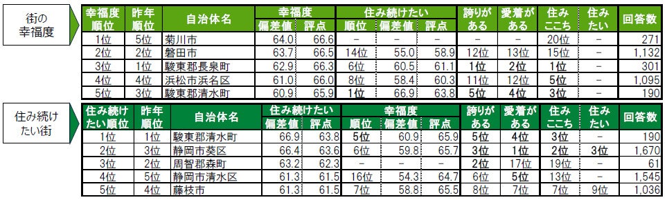 住み続けたい街の1位は2年連続で駿東郡清水町。2位静岡市葵区、3位周智郡森町。
