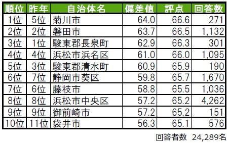 駿東郡清水町が、2年連続で1位に輝きました。2位は昨年3位から一つ順位を上げた静岡市葵区、3位は周智郡森町です。