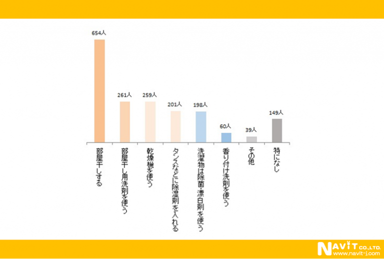 衣類に関する梅雨対策は「部屋干しする」が最も多くて654人。回答数に対する割合は3分の1を超えています。除湿剤や除菌・漂白剤、香り付け洗剤など薬剤を使う人も多いですね。