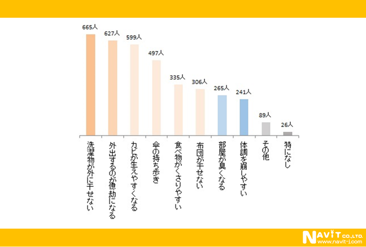 梅雨の時期に困ることや心配なことを複数回答可で質問しました。「洗濯物が外に干せない」665人、「外出するのが億劫になる」627人と「カビが生えやすくなる」599人がトップ3。「傘の持ち歩き」も497人と多いですね。