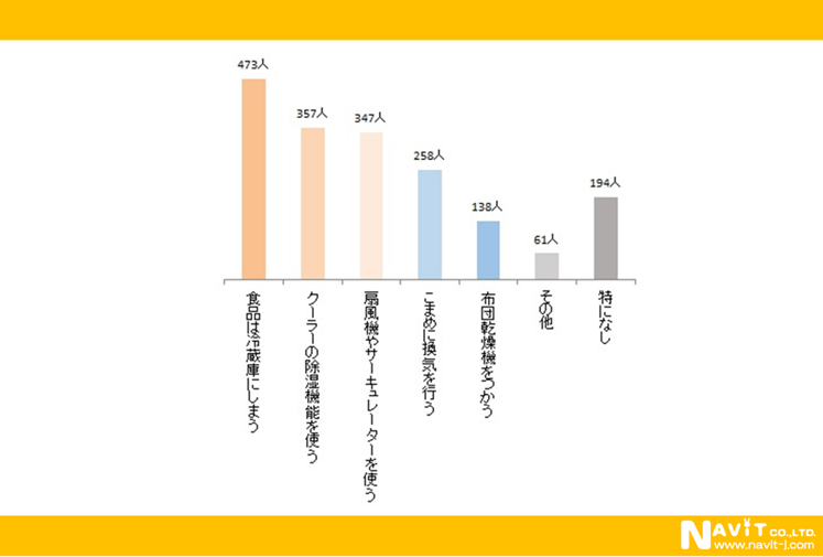 梅雨対策のトップは「食品は冷蔵庫にしまう」がトップで473人。「クーラーの除湿機能を使う」357人、「扇風機やサーキュレーターを使う」347人がこれに続いています。