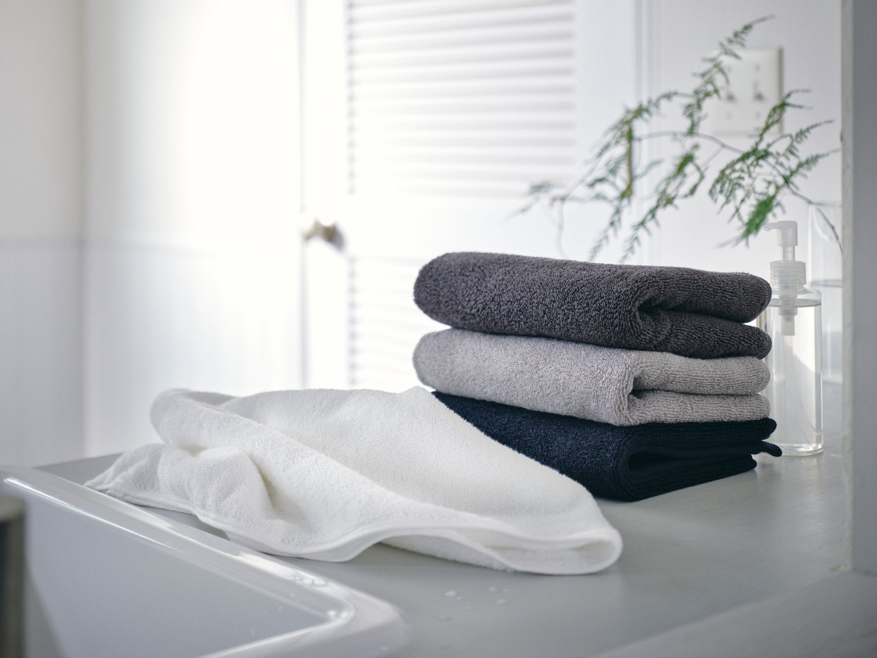 サイズはハンドタオル(ループ付き)、フェイスタオル、バスタオル、大判バスタオルの4種類で、色は暮らしに自然と馴染んで使いやすい淡色3色(オフ白・ライトグレー・ピンクベージュ)、濃色3色(チャコール・グリーン・ネイビー)を品揃えしました。