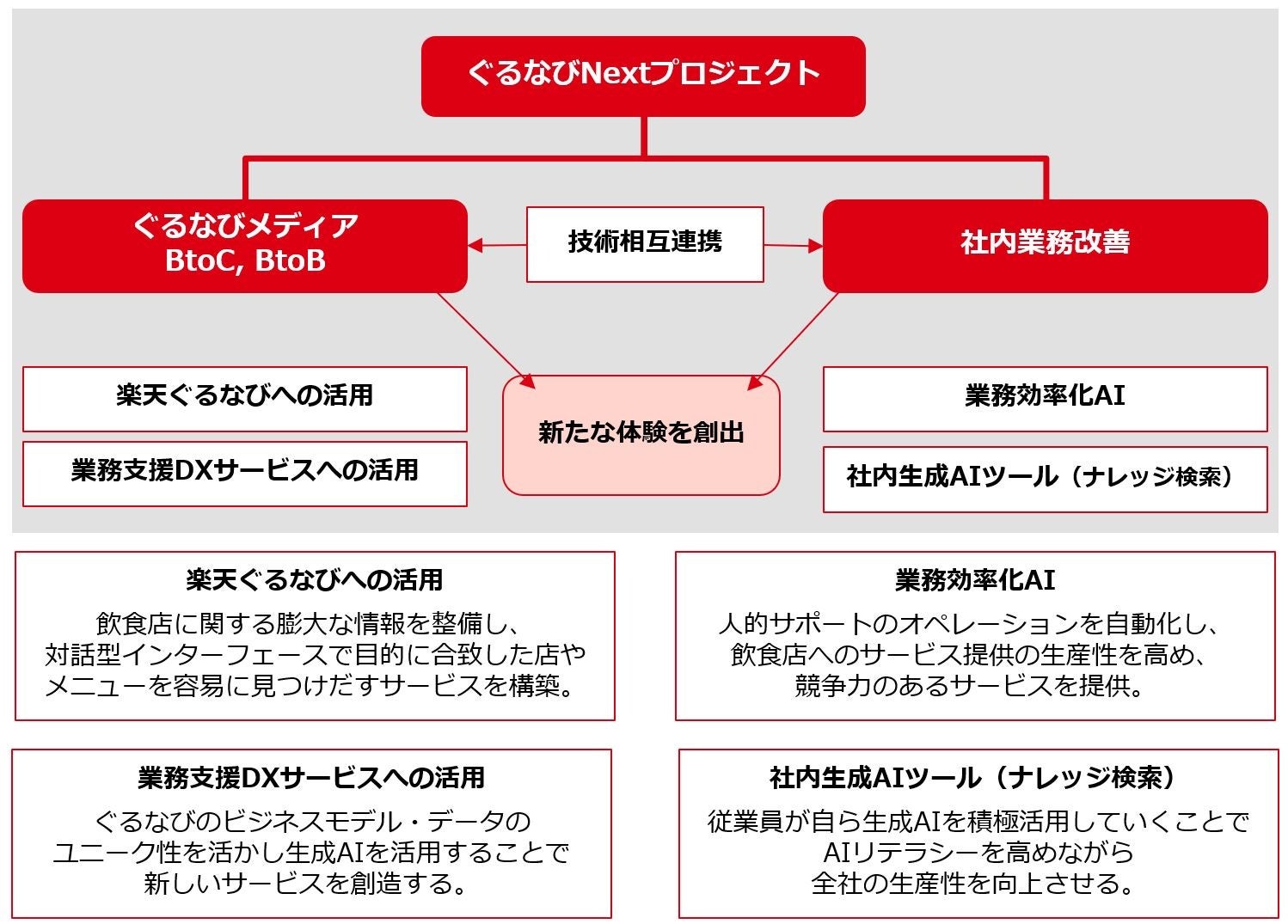 ぐるなびは、生成AIを活用してぐるなび全体の技術革新・DXを実現する「ぐるなびNextプロジェクト」を2024年8月より本格的に推進し、メディアの強化、業務改善、さらに生産性向上を目的とした様々な施策を短期間で進めてきました。今後も、「食でつなぐ。人を満たす。」というぐるなびのPURPOSE(存在意義)のもと、社内外におけるAIの活用を拡充し、「次世代食体験の実現」と「圧倒的な業務効率化」を目指します。