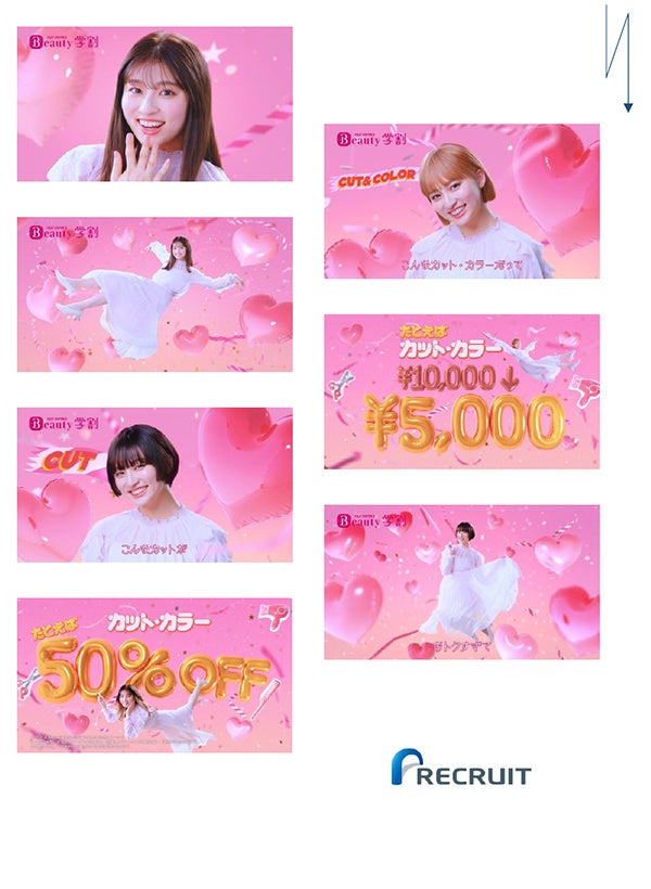 ピンクのグラデーションでまとめられた空間に、バルーンと一緒にふんわりと浮かび「こ〜んなに、浮いちゃいまーす!」と、うれしそうな様子で呼びかける吉川さん。「学割で、例えば50%美容室代浮いちゃいまーす!」と呼びかけた瞬間、吉川さんはマニッシュショートに変身。さらにポイントカラーやミルクティーカラーのミニボブと3つのヘアスタイルにチェンジしていきます。リラックスした雰囲気でふわふわと浮かびながら、うつぶせになったり、バルーンの上で弾んでみたり、さまざまなポーズを見せる吉川さん。CMの最後は「ウキウキが〜!止まらないぃ〜!ホットペッパービューティー学割」と決めポーズ。思わず浮き立つ心が表現された、キュートでポップなCMとなりました。