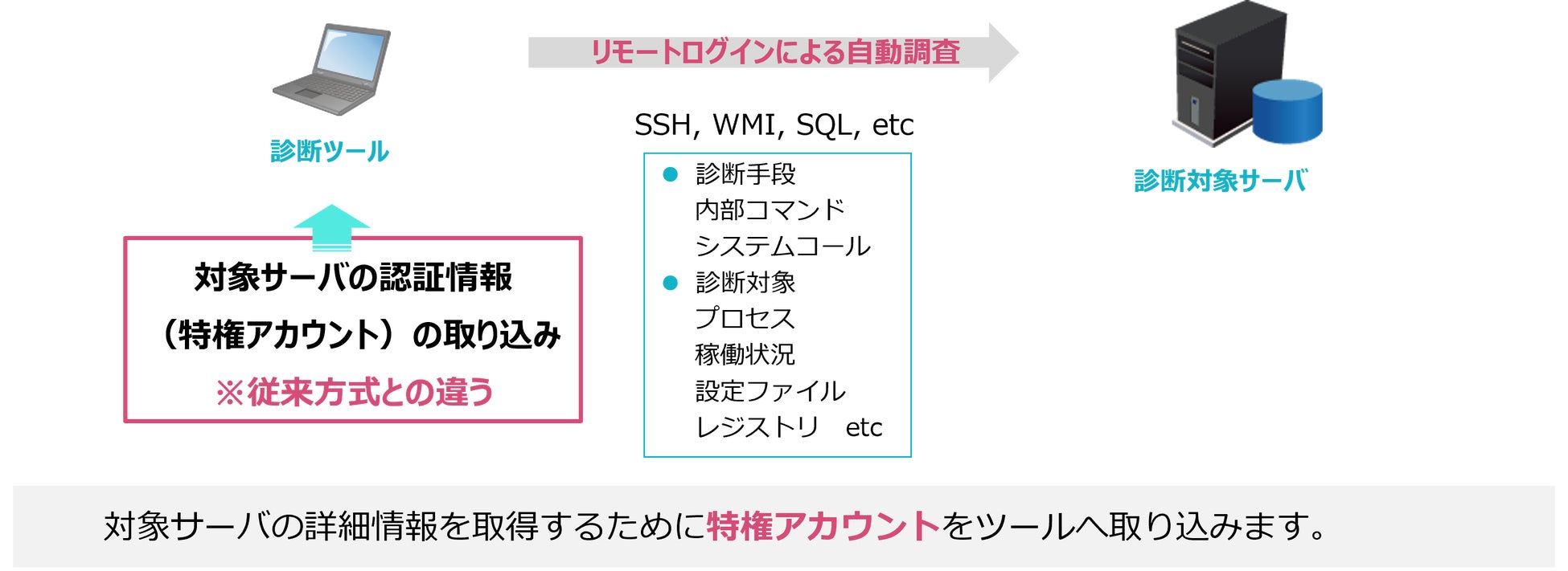 一方、本サービスで提供する認証スキャンにおいては、対象サーバにログイン後、サーバ内部からスキャンを実施し潜在的なリスクを可視化することで、他システムと連携していないソフトウェアの脆弱性も検出することができます。本サービスでは、システムの特権を検査に組み込むことにより、非認証スキャンで検出できない脆弱性の検出が可能になりました。