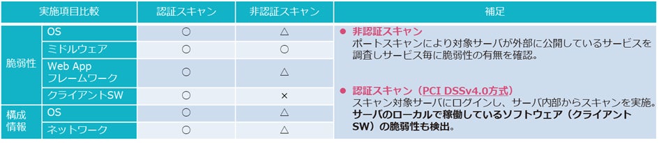 本サービスは、ペイメント業界のお客さまを中心に、PCI DSSv4.0準拠対応で2025年4月以降必須となる認証スキャンの導入を支援するサービスです。PCI DSSv4.0準拠対応以前の従来方式の非認証スキャンでは、スキャン対象サーバへのログインは行わず、ポートスキャンにより対象サーバが外部に公開しているサービスを調査し、サービス毎に脆弱性の有無の確認を行っていました。